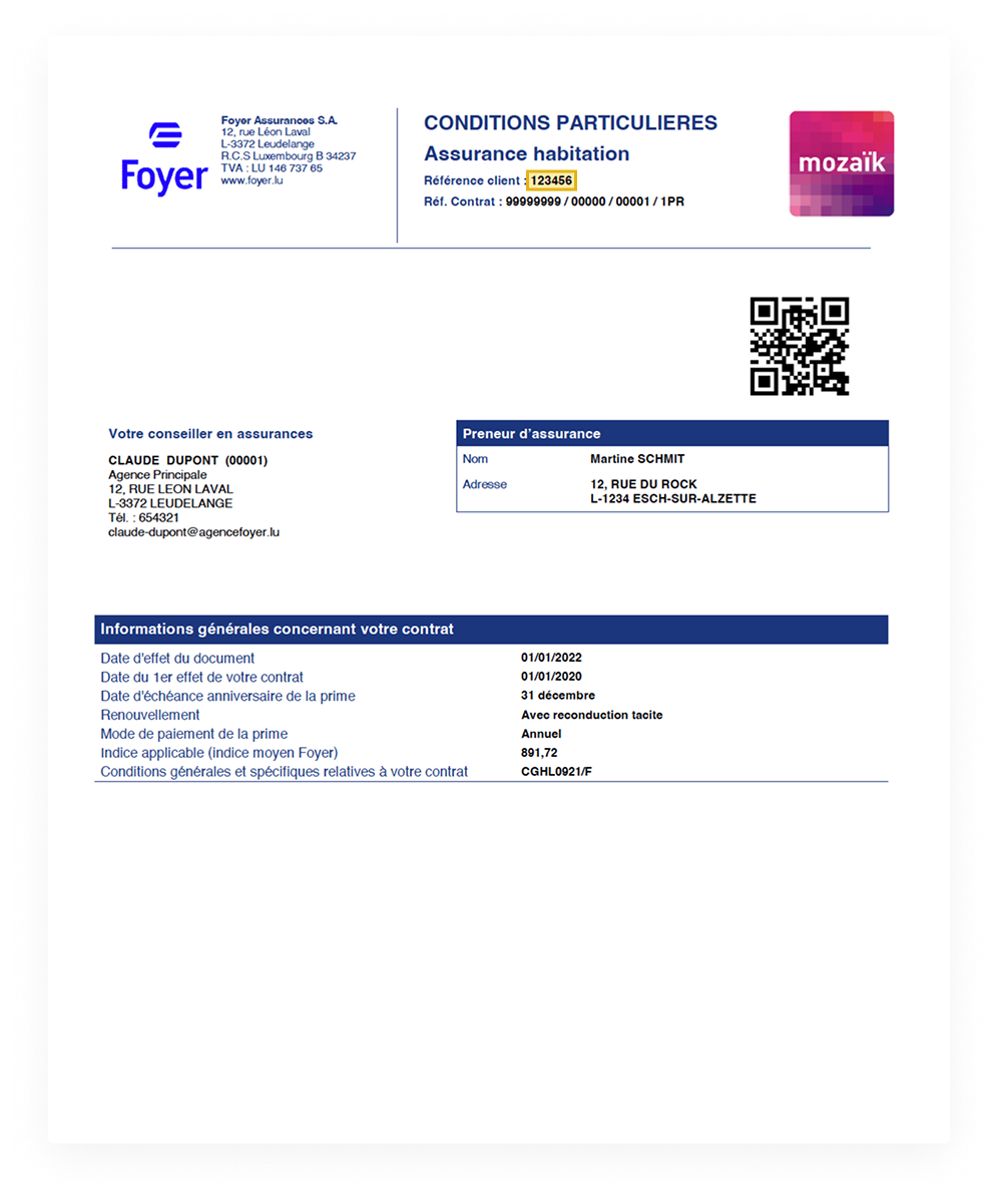 Pour consulter les Conditions Générales de votre contrat, vous avez besoin de votre numéro de client et de votre numéro de contrat. Ces informations sont imprimées sur vos Conditions Particulières reçues par courrier. Un exemple d’entête est présenté pour vous montrer où ces numéros apparaissent.